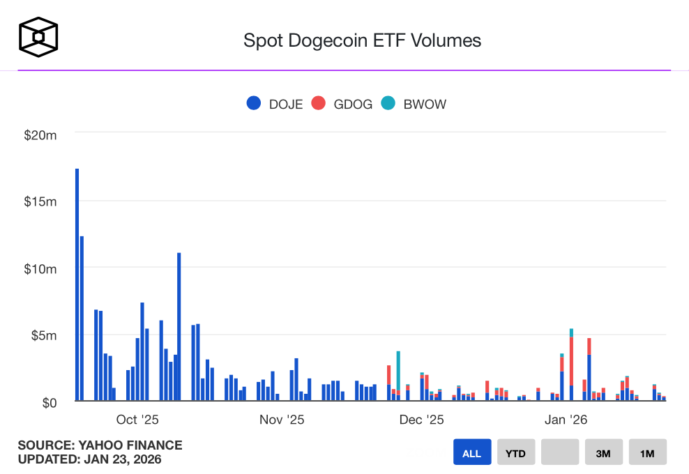 طبق دادههای منتشرشده، مجموع حجم معاملات ETFهای دوج کوین از زمان عرضه اولیه DOJE تاکنون تنها حدود ۲۰۰ میلیون دلار بوده است و این صندوقها در مجموع کمتر از ۴۰ میلیون دلار دارایی تحت مدیریت دارند.
