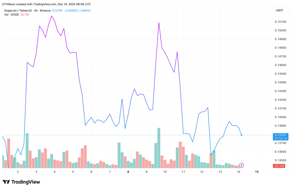 در مقابل این تصویر بلندمدت، نمودار چهار ساعته شرایط متفاوتی را نشان میدهد. دوج کوین در حال حاضر حوالی ۰.۱۳۷ دلار معامله میشود و با نزدیک شدن به نیمه دسامبر، نوسانات درونروزی و کاهش حجم معاملات کاملاً مشهود است.