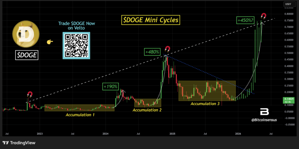 نموداری که بیتکوینسنسیس ارائه کرده، بازار فعلی را در مراحل ابتدایی سومین دوره انباشت نشان میدهد. منطق این چارچوب تحلیلی بر این اساس است که اگر DOGE بار دیگر از همان ریتم تاریخی پیروی کند، رسیدن به سقفهای قیمتی جدید در اوایل سال ۲۰۲۶ کاملاً با رفتار چرخههای قبلی آن همخوانی خواهد داشت.