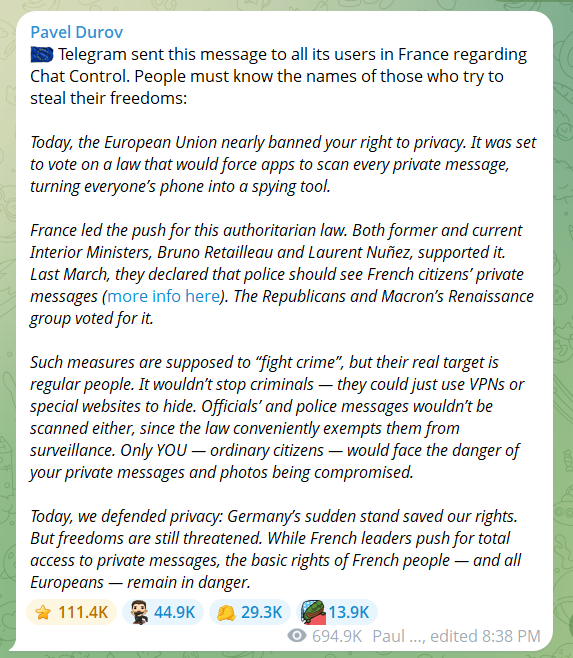 به گفته دوروف، فرانسه نقش اصلی را در پیشبرد این قانون داشته و وزیران کشور سابق و فعلی این کشور، برونو ریتایو (Bruno Retailleau) و لوران نونهز (Laurent Nuñez)، از حامیان جدی آن بودهاند. او تأکید کرد که هدف ظاهری این قانون «مبارزه با جرایم آنلاین» عنوان شده، اما در واقع، مردم عادی را به مظنون دائمی تبدیل میکند و راه را برای نظارت گسترده دولتها بر ارتباطات شخصی باز میگذارد.