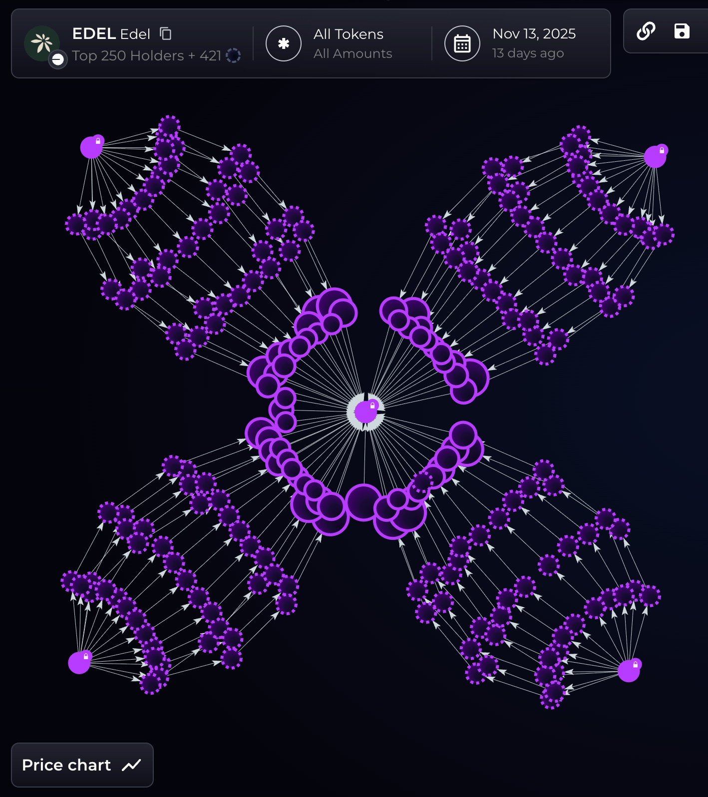 ماجرا از آنجا شروع شد که پلتفرم تحلیل آنچین بابلمپس اعلام کرد حدود ۱۶۰ کیف پول در زمان لانچ توکن EDEL، تقریباً ۳۰٪ از کل عرضه را به ارزش حدود ۱۱ میلیون دلار انباشت کردهاند. بهگفته بابلمپس، این کیف پولها پیش از باز شدن معاملات بهصورت هماهنگ شارژ شدهاند. مسیر گردش سرمایه نیز نشان میدهد که این کیف پولها احتمالاً توسط یک منبع یا گروه واحد مدیریت شدهاند.