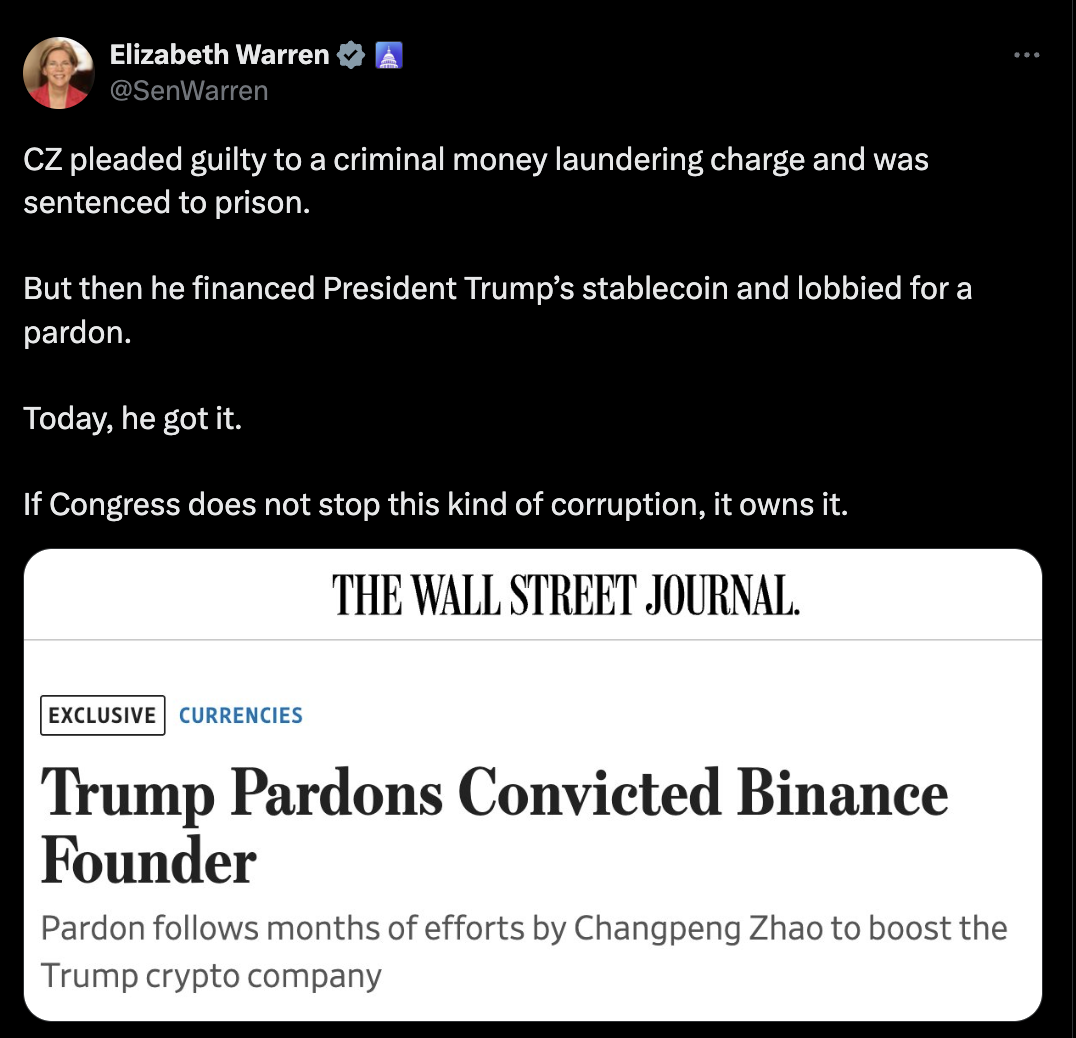 در نوامبر ۲۰۲۳، ژائو به دلیل رعایت نکردن قوانین ضدپولشویی در بایننس، گناهکار شناخته شد و دادگاه فدرال سیاتل او را به چهار ماه زندان محکوم کرد. وارن در پست خود افزوده بود که CZ «برای کمک به استیبل کوین ترامپ مالیات پرداخت کرده و برای دریافت حکم عفو از ترامپ لابی کرده است». این اظهارنظر به انتقاداتی دامن زد که معتقدند روابط بین بایننس و خانواده ترامپ میتواند به دامن زدن به فساد منجر شود.