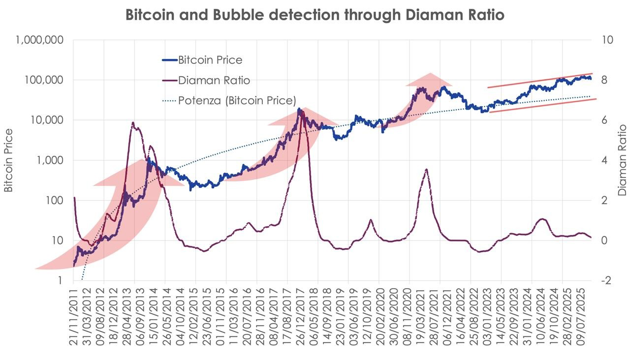 دایمن پارتنرز دادههای تاریخی قیمت بیت کوین را بررسی و مشخص کرده است که در چرخههای پیشین، بیت کوین چندین بار وارد فاز رشد بیش از نمایی شده بود. اما در چرخه اخیر، جز در مقطع کوتاهی همزمان با تأیید صندوقهای ETF اسپات در ایالات متحده و عبور قیمت از اوج سال ۲۰۲۱ پیش از هاوینگ ۲۰۲۴ (اتفاقی بیسابقه در تاریخ بیت کوین) دیگر شاهد رشد بیش از نمایی نبودهایم.