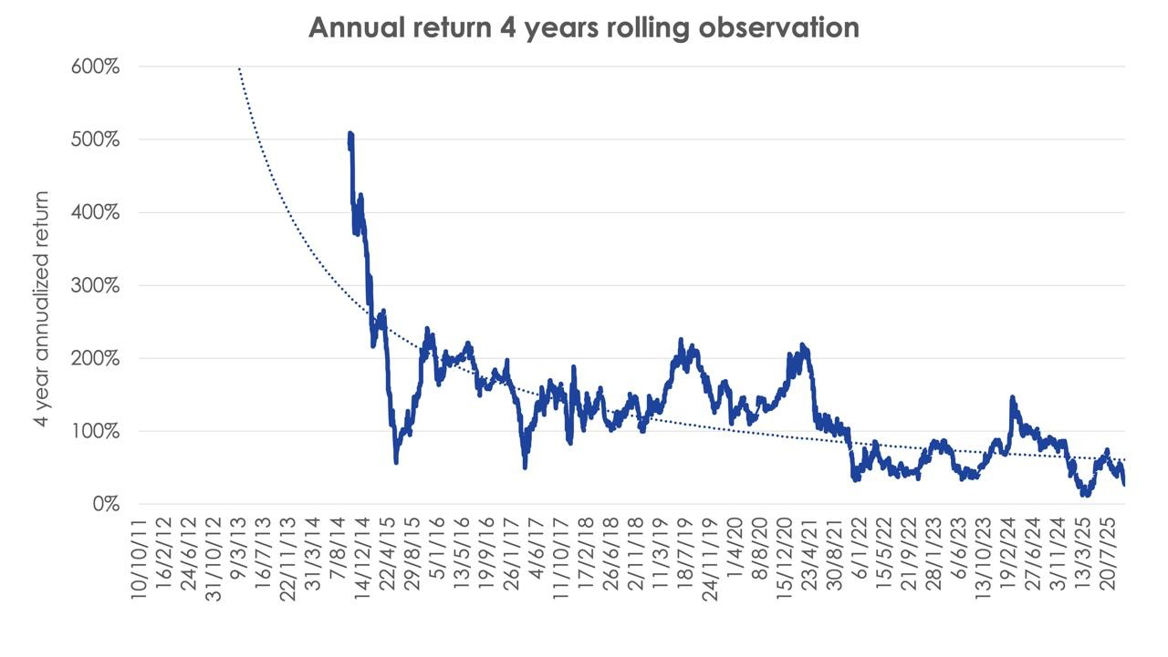 پرسشی که اکنون مطرح میشود این است که آیا باید الگوی چهارساله را کنار بگذاریم؟ پاسخ قطعی هنوز روشن نیست، اما شواهد نشان میدهد ساختار رشد بیت کوین دگرگون شده است. برای آزمودن این فرضیه، پژوهشگران نوسان قیمت بیت کوین را در بازهای چهارساله بررسی کردهاند تا ببینند آیا این نوسان ثابت مانده یا کاهش یافته است.