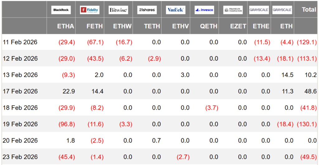 ETFهای اسپات اتریوم نیز طی هفته‌های اخیر عملکرد ضعیفی داشته‌اند. از ۱۱ فوریه تاکنون حدود ۴۰۵ میلیون دلار سرمایه از این صندوق‌ها خارج شده و ارزش کل دارایی تحت مدیریت آن‌ها به ۱۲.۴ میلیارد دلار کاهش یافته است. این روند درست زمانی شدت گرفته است که قیمت طلا به بالای ۵٬۱۵۰ دلار رسیده و ETFهای طلا سرمایه ورودی زیادی را جذب کرده‌اند. این رفتار نشان می‌دهد موسسات مالی فعلا تمایلی به نگهداری دارایی‌های پرریسک ندارند.