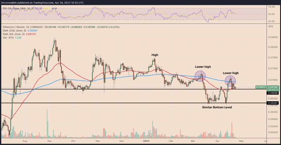 همانطور که در تصویر بالا مشخص است، نمودار ETH/BTC در ماه مارس پس از آزمایش مقاومت میانگین متحرک نمایی ۲۰۰ روزه (منحنی آبی رنگ) با ریزش شدیدی مواجه شد و به زیر منحنی قرمز نیز رسید.