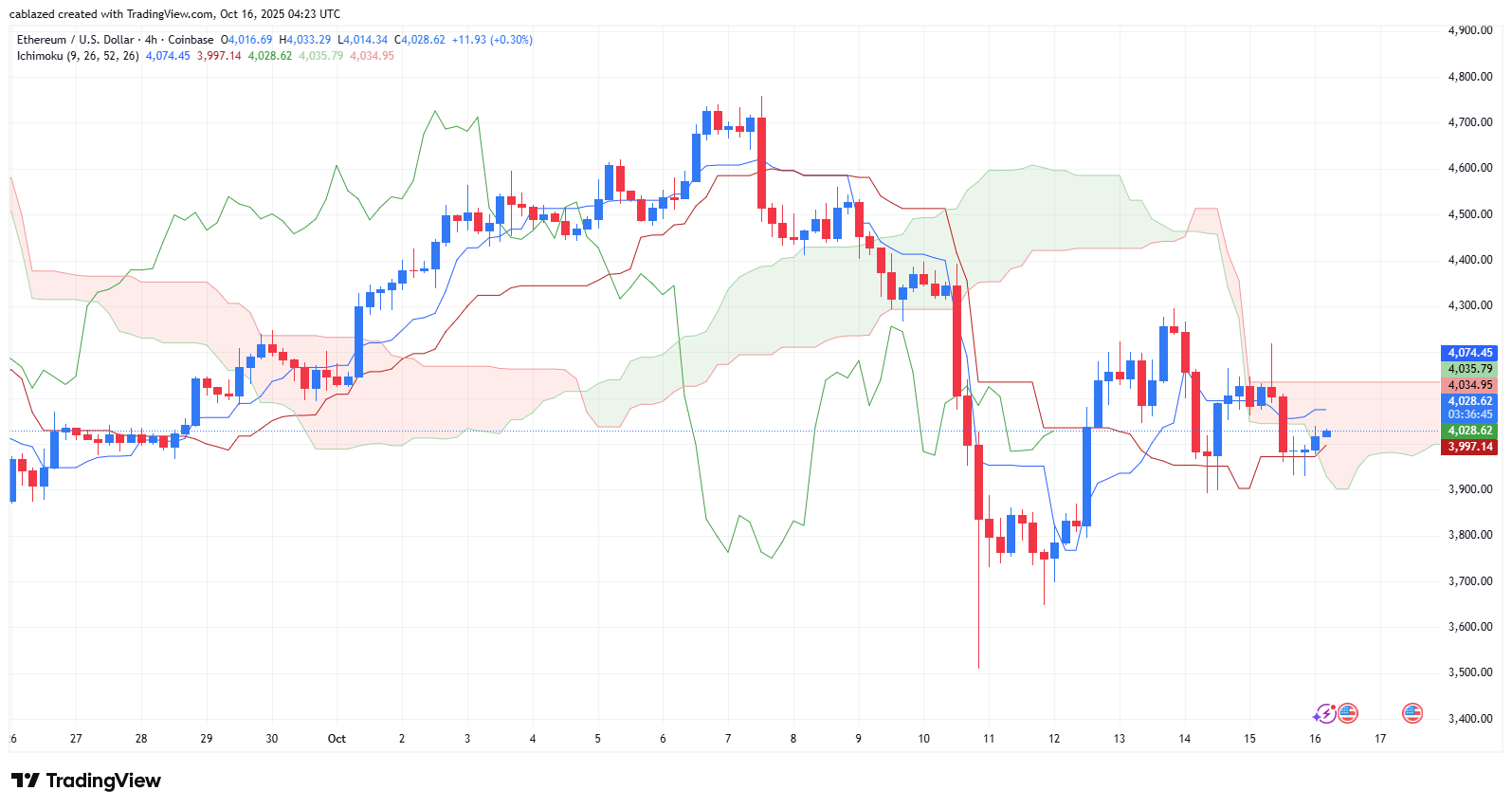 قیمت اتریوم در نمودار چهار ساعته در یک وضعیت خنثی و بلاتکلیف قرار گرفته است. قیمت در حال حاضر در محدوده ۴,۰۲۸.۶۲ دلار در نوسان بوده و دقیقاً در زیر لبه پایینی ابر کومو در حال مبارزه است که این ابر به عنوان یک مقاومت دینامیک عمل می‌کند. خطوط تنکانسن و کیجون‌سن به یکدیگر نزدیک شده و تقریباً صاف حرکت می‌کنند که نشان‌دهنده یک دوره تثبیت قیمت و عدم وجود روند قدرتمند در کوتاه‌مدت است. چیکو اسپن نیز در نزدیکی نمودار قیمت حرکت می‌کند که این موضوع نیز تأییدی بر دوره استراحت بازار است.