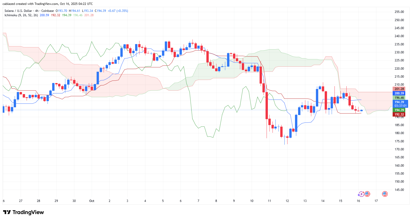 نمودار چهار ساعته قیمت سولانا وضعیتی مشابه اتریوم را نشان می‌دهد و در یک فاز تثبیت و خنثی به سر می‌برد. قیمت که در حال حاضر ۱۹۴.۳۹ دلار است، در زیر ابر کومو قرار دارد و این ابر به عنوان یک مقاومت سنگین عمل می‌کند. خطوط تنکانسن و کیجون‌سن نیز به صورت صاف و درهم‌تنیده حرکت می‌کنند که نشان از تعادل میان خریداران و فروشندگان و نبود یک روند مشخص در بازار دارد. ابر کوموی پیش رو نیز قرمز رنگ و ضخیم است که نشان می‌دهد مقاومت در این ناحیه قدرتمند است.