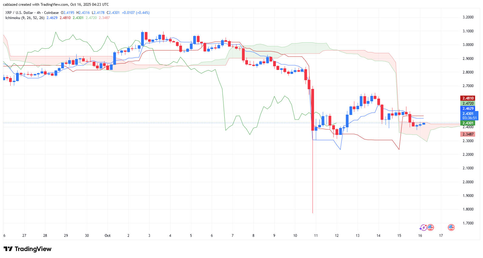 در نمودار چهار ساعته، قیمت ریپل در یک روند نزولی آشکار بوده و در حال حاضر پایین‌تر از ابر کومو قرار دارد که نشان‌دهنده غلبه فشار فروش در بازار است. قیمت در حوالی ۲.۴۳۰۱ دلار در حال نوسان است و خطوط تنکانسن (آبی) و کیجون‌سن (قرمز) نیز در وضعیت نزولی قرار دارند، به طوری که تنکانسن پایین‌تر از کیجون‌سن حرکت می‌کند. چیکو اسپن (خط سبز) نیز در زیر نمودار قیمت قرار گرفته که تأییدی دیگر بر ضعف روند فعلی است. نزدیک‌ترین مقاومت مهم، خط کیجون‌سن در قیمت ۲.۴۸۱۰ دلار و پس از آن محدوده ابر کومو است.