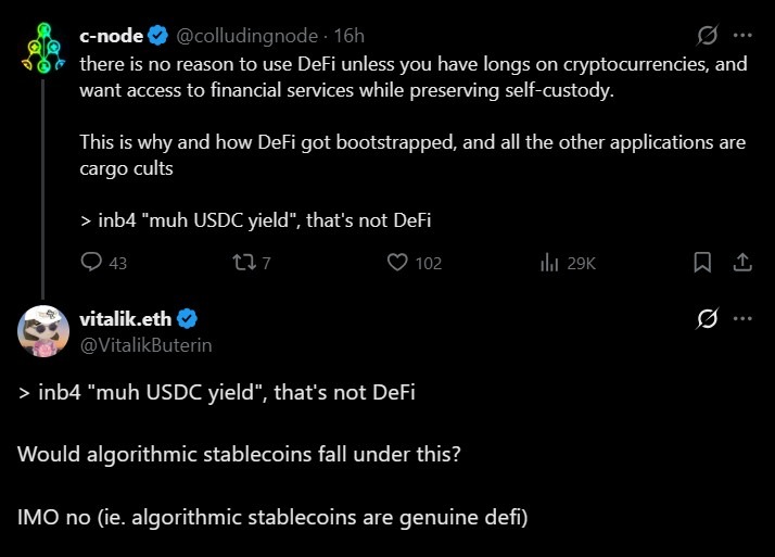 اظهارات بوترین در زمانی مطرح میشود که توجهات دوباره به کاربردهای غالب دیفای، به ویژه بازارهای وامدهی مبتنی بر استیبل کوینهایی مانند یواسدی کوین (USDC)، جلب شده است. هرچند او نام پروتکل مشخصی را ذکر نکرد، اما بهطور واضح محصولاتی را هدف قرار داد که بر پایه «ییلد USDC» ساخته شدهاند.