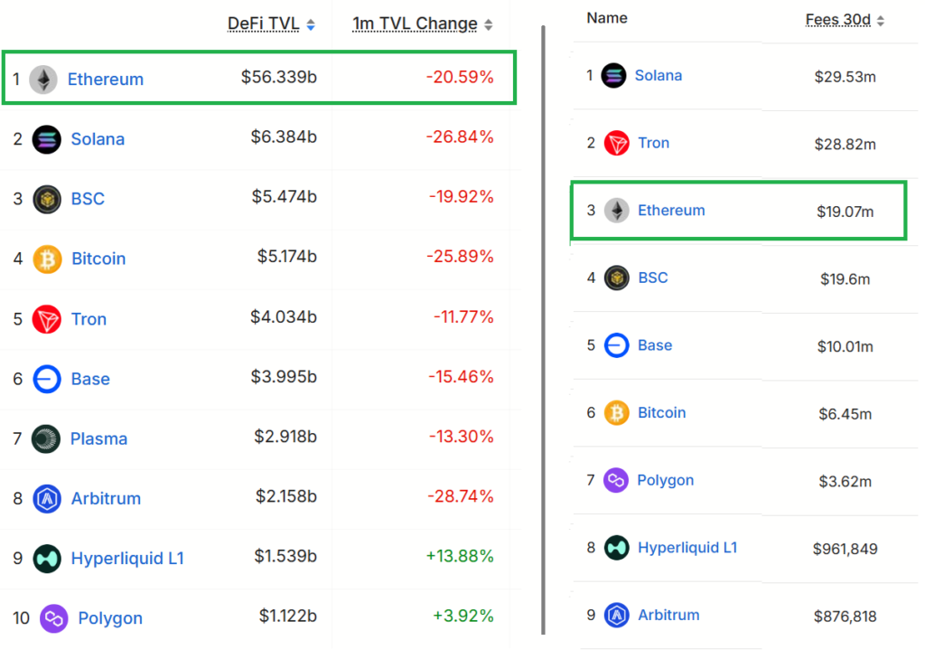 بلاک چین‌ها بر اساس TVL (چپ) و کارمزدهای 30 روزه (راست) و دلار آمریکا رتبه‌بندی شده‌اند – منبع: DefiLlama
