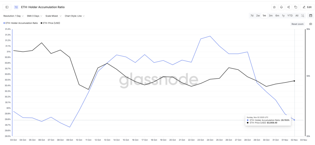 نسبت انباشت هولدرها که نشان میدهد کیف پولهای فعال چه میزان به موجودی خود اضافه کردهاند، به عدد ۲۹.۷۹٪ رسیده است؛ این مقدار دومین سطح پایین در یک ماه گذشته محسوب میشود. آخرین بار که چنین افتی در تاریخ ۹ اکتبر (۱۸ مهر) ثبت شد و این شاخص به ۲۹.۶۶٪ رسید، قیمت اتریوم از ۴,۳۷۰ دلار تا ۳,۷۵۰ دلار حدود ۱۴٪ سقوط کرد.