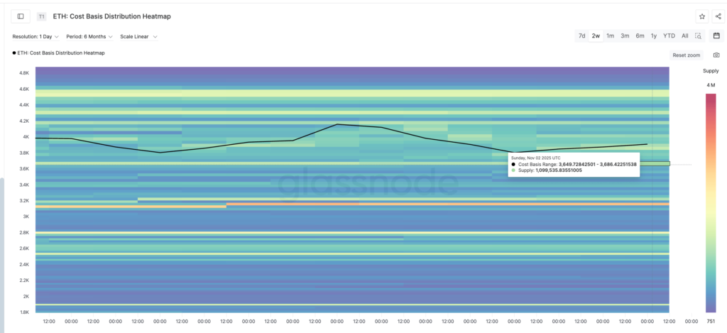 با این حال، دادههای بهدستآمده از نقشه حرارتی توزیع قیمت مبنا (Cost Basis Heatmap) نشان میدهد که در محدوده ۳,۶۴۹ تا ۳,۶۸۶ دلار، یک خوشه حمایتی قوی وجود دارد که در آن حدود ۱.۰۹ میلیون واحد اتریوم آخرین بار معامله شده است. این نقشه حرارتی در واقع سطوحی از قیمت را نشان میدهد که سرمایهگذاران آخرین بار در آن خرید انجام دادهاند و به همین دلیل، نواحی کلیدی حمایت و مقاومت را بر اساس رفتار گذشته بازار مشخص میکند.