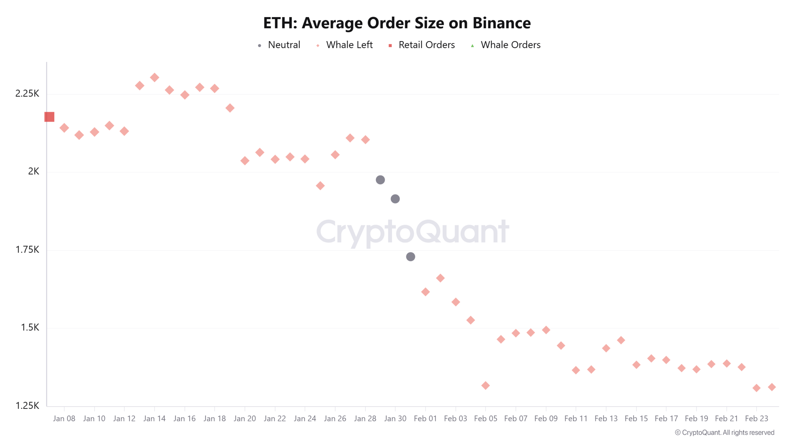 آمارهای آنچین منتشر شده توسط پلتفرم کریپتوکوانت (CryptoQuant) نشان میدهد که میانگین حجم سفارشهای فروش متعلق به نهنگهای اتریوم در صرافی بایننس، در هفتههای اخیر به حدود ۱,۳۵۰ اتریوم کاهش یافته است. این در حالی است که این رقم در اوایل ژانویه ۲۰۲۶ میلادی (دی ۱۴۰۴) نزدیک به ۲,۲۵۰ اتریوم بود. برآوردها نشان میدهد که طی ۴۵ روز گذشته، مجموع گردش مالی سفارشهای بزرگ فروش حدود ۱.۸ تا ۲ میلیون اتریوم بوده است.