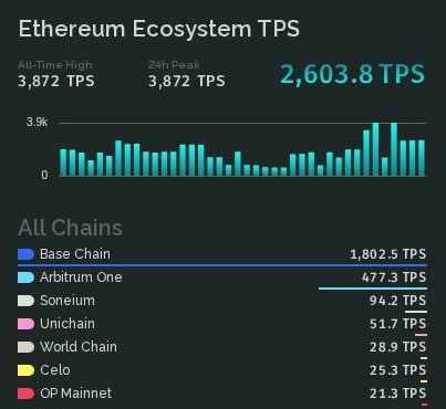 نرخ پردازش شبکه حتی پس از ثبت این اوج نیز بالا باقی ماند و در محدوده بیش از ۲٬۶۰۰ تراکنش در ثانیه تثبیت شد. در این میان، بلاکچین بیس (Base) به‌تنهایی بیش از نیمی از این فعالیت را به خود اختصاص داده است و با ۱٬۸۰۰ TPS در صدر قرار دارد. پس از آن، آربیتروم (Arbitrum) با حدود ۴۷۷ TPS در جایگاه دوم قرار گرفته است و لایه‌‌های ۲ جدیدتر مانند سونیوم (Soneium) نیز در حال افزایش سهم خود از ترافیک شبکه هستند.
