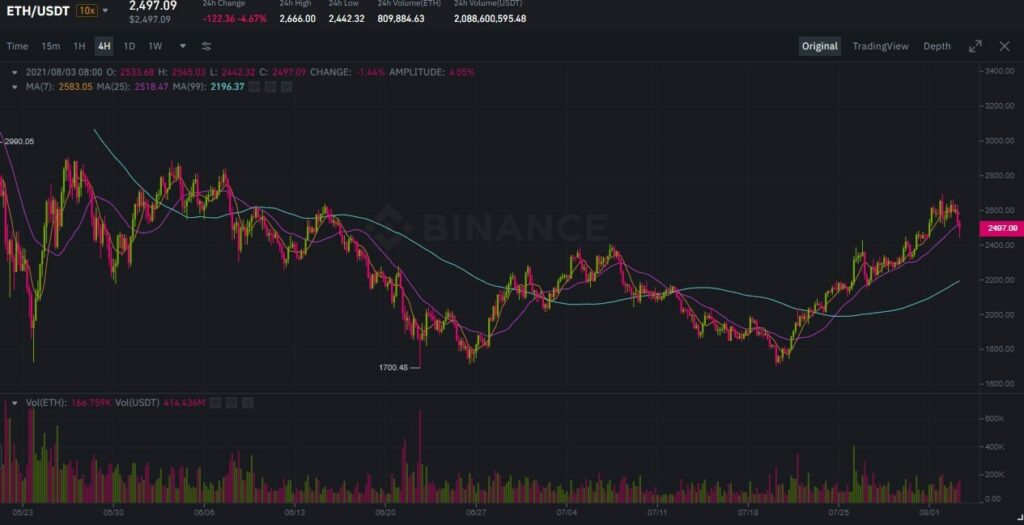 قیمت اتریوم پس از شکستن میانگین متحرک ۱۰۰ روزه به نزدیکی ۲۷۰۰ دلار رسید. در زمان نگارش این خبر اتریوم با ۶٪ کاهش نسبت به ۲۴ ساعت گذشته به قیمت ۲۴۷۰ دلار خرید و فروش میشود.