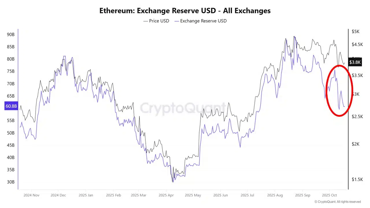 داده‌های آنچین نشان می‌دهد که میزان اتریوم هولدشده در صرافی‌ها به پایین‌ترین سطح خود در یک سال اخیر رسیده است. این کاهش یعنی توکن‌های کمتری برای فروش در دسترسند و بازار به‌تدریج در حال خشک شدن از نظر نقدینگی است.