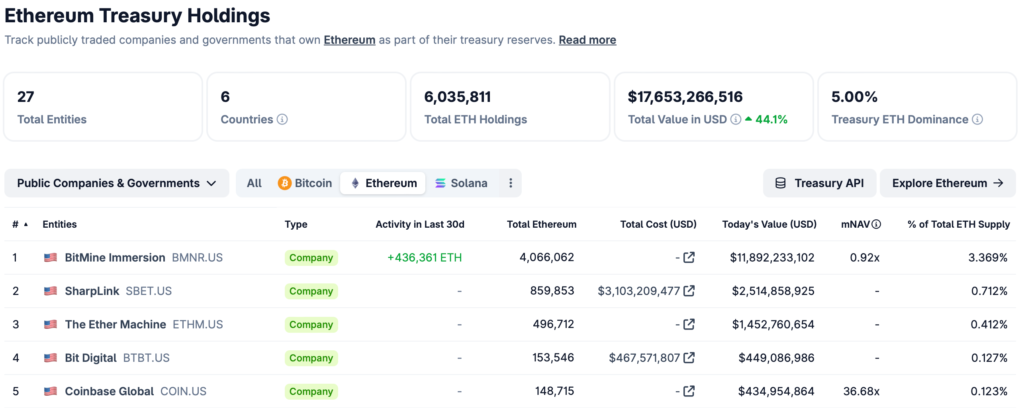 پنج شرکت برتر خزانه‌داری اتریوم – منبع: CoinGecko
