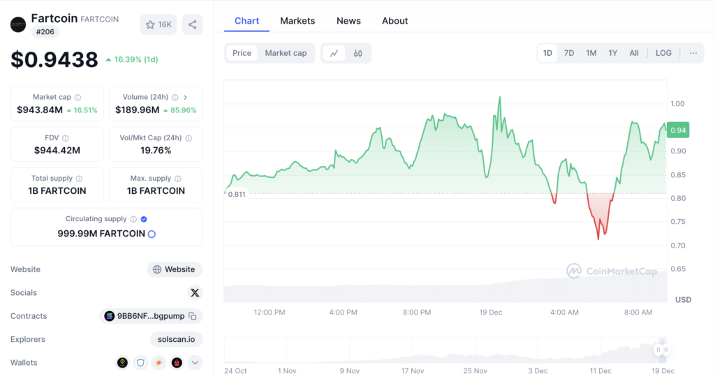 بر اساس دادههای کوین مارکت کپ (CoinMarketCap)، در تاریخ ۱۸ دسامبر (۲۸ آذر)، قیمت FARTCOIN، بهعنوان یک استثنا در بازار آلت کوینها، حدود ۲۱٪ افزایش یافت و به سطح ۱.۰۲ دلار رسید و ارزش بازار آن نیز از ۱.۰۲ میلیارد دلار عبور کرد.