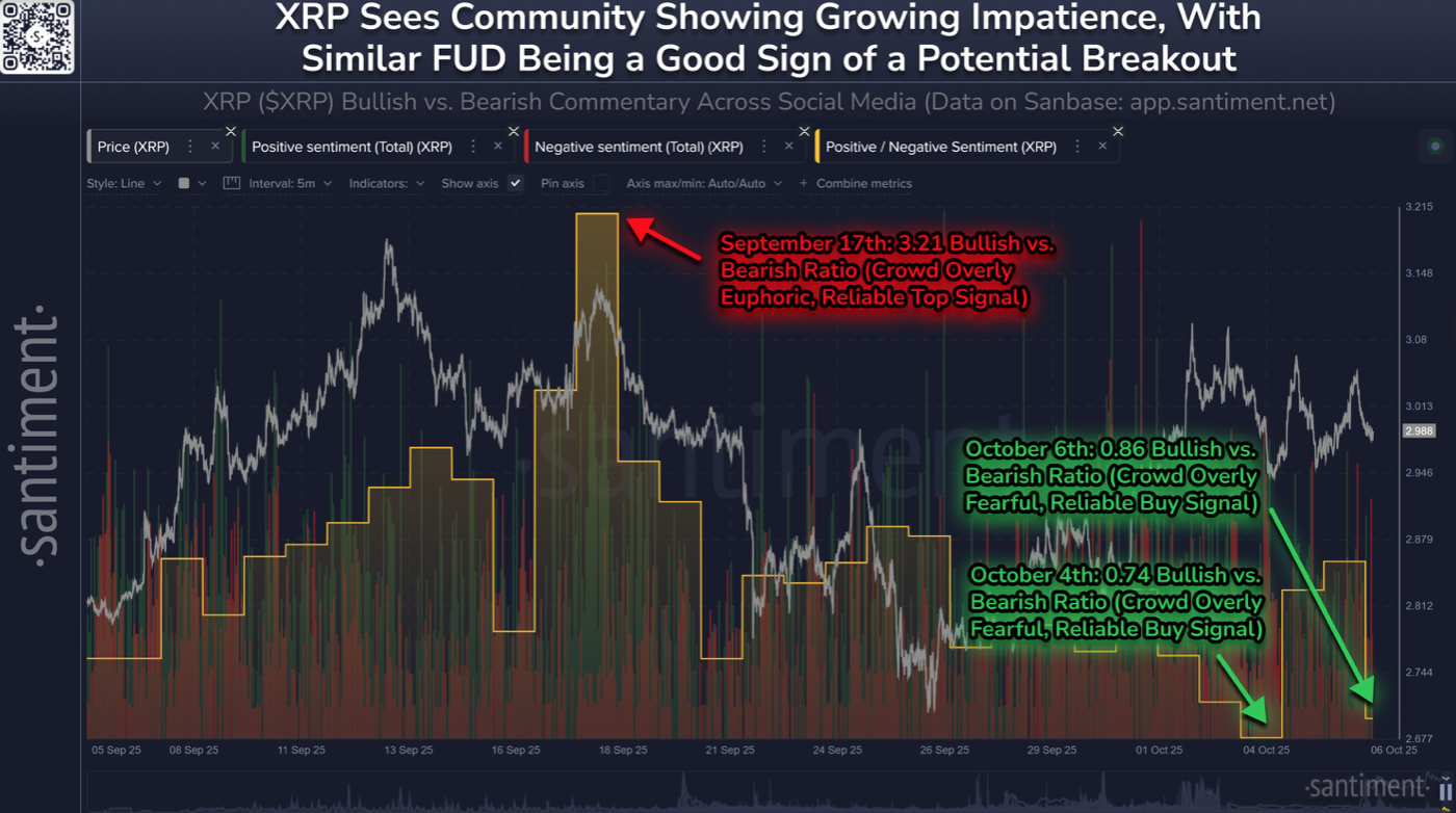 تحلیل دادههای پلتفرم سنتیمنت (Santiment) نشان میدهد نسبت احساسات صعودی به نزولی پیرامون ریپل در دو روز گذشته به زیر عدد ۱ سقوط کرده است. به بیان ساده، در شبکههای اجتماعی تعداد پستهای منفی درباره ریپل اکنون از محتوای مثبت آن بیشتر شده است. این وضعیت معمولاً نشانهای از بازگشت فاد در میان سرمایهگذاران خرد است.