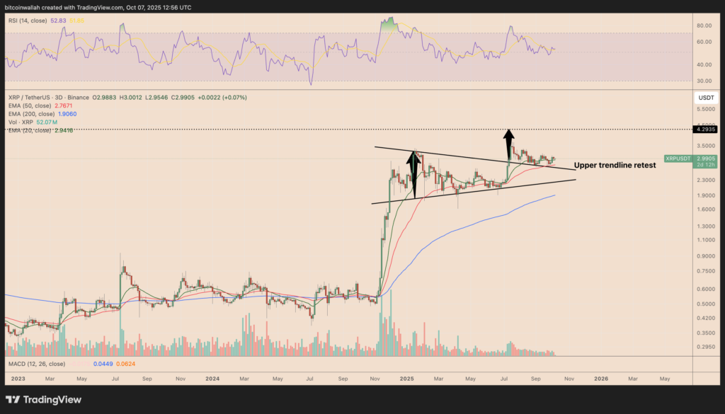 در صورت موفقیت این بازآزمایی، مسیر برای جهش احتمالی تا سطح ۴.۲۹ دلار هموار خواهد شد که حدود ۴۵٪ بالاتر از قیمت فعلی قرار دارد و با پیشبینیهای صعودی قبلی درباره ریپل همراستاست. با این حال، اگر قیمت نتواند بالای این خط روند باقی بماند، احتمال بازگشت و اصلاح عمیقتر تا محدوده ۲.۳۳ دلار نیز وجود دارد.