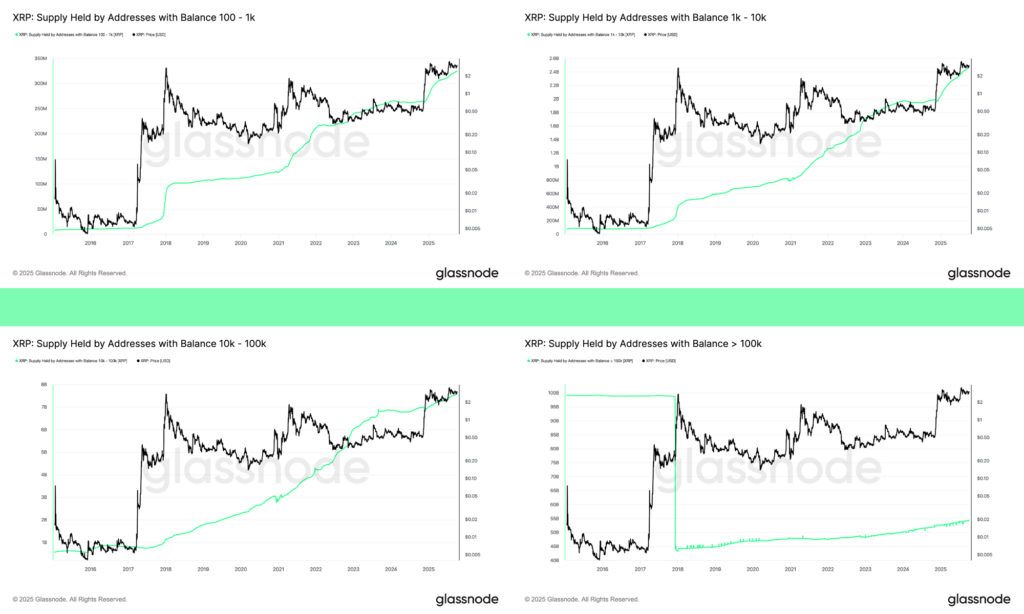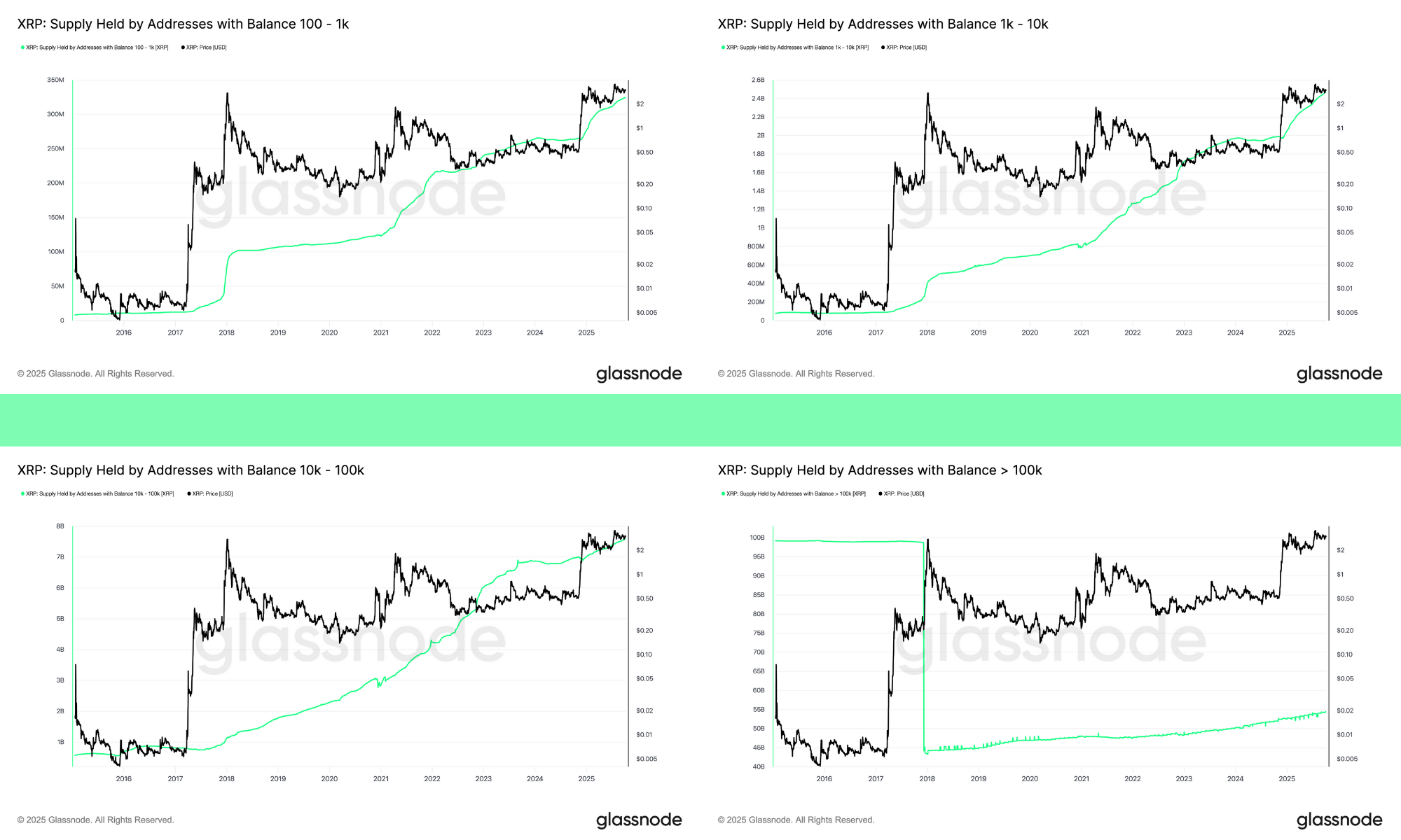 دادههای آنچین پلتفرم گلسنود (Glassnode) نیز چنین سناریویی را تأیید میکند. موجودی ریپل در اختیار آدرسهایی که بیش از ۱۰۰ واحد از این توکن را نگهداری میکنند، در ماههای اخیر بهطور پیوسته افزایش یافته است که نشان میدهد سرمایهگذاران بزرگ در حال استفاده از دورههای نوسانی برای انباشت هستند.