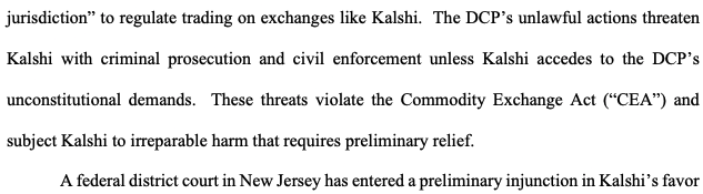کالشی یک روز بعد از این اقدام شکایت کرد و گفت قراردادهای رویدادی آن طبق قوانین فدرال قانونی هستند و فعالیتهایش تحت صلاحیت انحصاری CFTC قرار دارد.