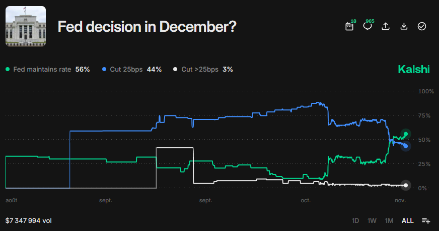 جالب اینجاست که بازارهای پیشبینی مانند کالشی (Kalshi) حتی بدبینترند و ۵۵٪ احتمال میدهند که فدرال رزرو هیچ تغییری در ماه دسامبر ایجاد نکند. پالیمارکت (Polymarket) نیز تقریباً همین نگاه را دارد و احتمال ثبات نرخ را ۵۴٪ میداند.