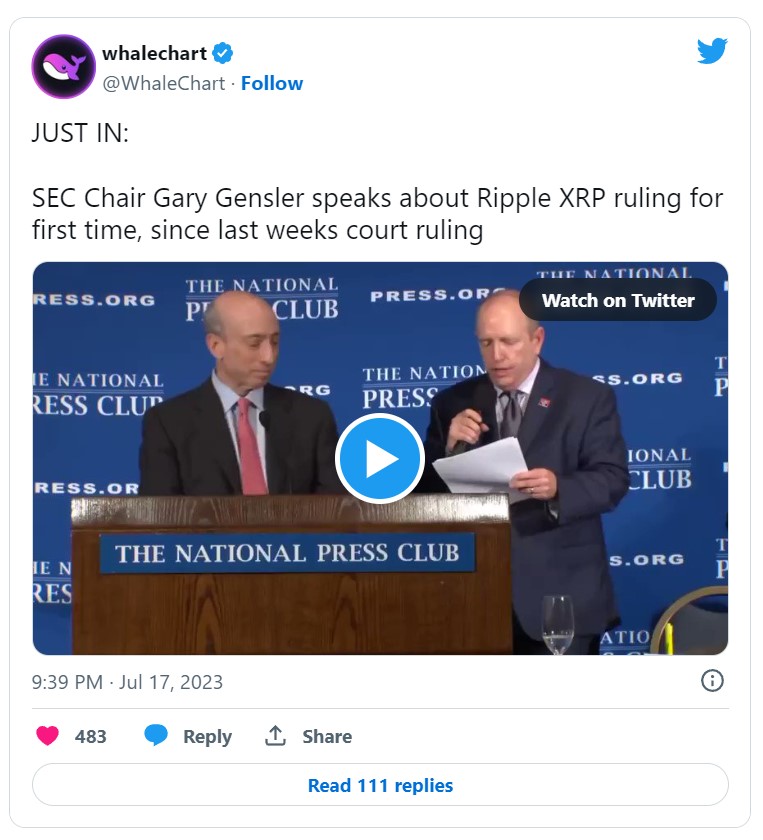 گری گنسلر (Gary Gensler)، رییس کمیسیون بورس و اوراق بهادار ایالات متحده (SEC) در طی یک سخنرانی در مورد هوش مصنوعی صحبت کرد. پس از آن، وی در مصاحبهای از اظهار نظر مستقیم در مورد پرونده ریپل خودداری کرد و دلیل این سکوت را به پایان نرسیدن این دعوای حقوقی اعلام کرد. وی برای اولین بار تنها به اظهاراتی مختصر در مورد حکم دادگاه بسنده کرد و اظهار نارضایتی از حکم دادگاه کرد. تاکنون، پس از صدور حکم دادگاه، دو مرتبه از گنسلر در مورد ریپل سوال شده و پیام اصلی او این بوده است که ترجیح میدهد در مورد آن صحبت نکند.