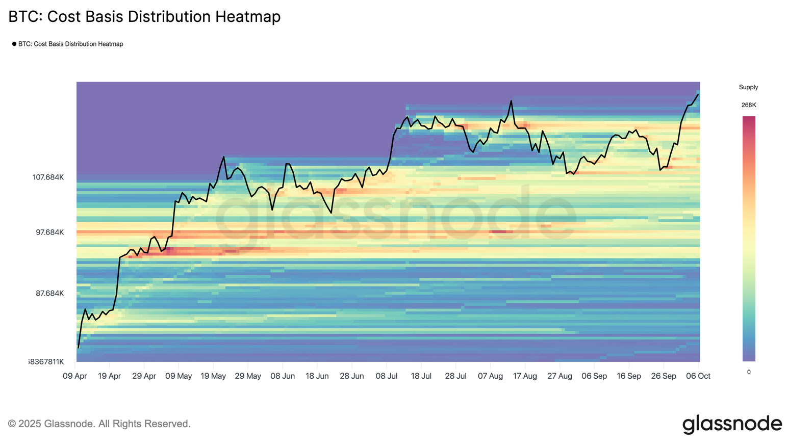 در ادامه گزارش، گلسنود با استفاده از نقشه حرارتی توزیع بهای تمامشده (Cost Basis Distribution Heatmap) محدودههای حمایتی ساختاری بیت کوین را مشخص کرده است. بر اساس دادههای این ابزار، سطح حمایت میان ۱۲۰,۰۰۰ تا ۱۲۱,۰۰۰ دلار نسبتاً ضعیف است، اما حمایت قویتری در محدوده ۱۱۷,۰۰۰ دلار شکل گرفته که حدود ۱۹۰,۰۰۰ BTC آخرین بار در آن خریداری شده است. در این گزارش آمده است: