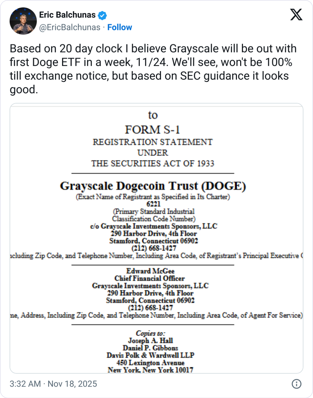 بالکوناس پیشبینی میکند ETFهای دوج کوین گریاسکیل روز ۲۴ نوامبر (۳ آذر) راهاندازی شود. تراست دوج کوین گریاسکیل، از صندوق موجود تبدیل میشود و روی بورس نیویورک معامله خواهد شد، هرچند بورس هنوز باید برای لیستینگ ETF درخواست ارائه کند.