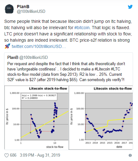 با وجود اظهار نظرات مختلف در خصوص عدم تغییر عملکرد قیمت لایت کوین پس از هاوینگ (نصف شدن پاداش) و ارتباط آن با هاوینگ آتی بیت کوین، PlanB تحلیلگر معروف اشاره کرد که نتیجه گیری فوق درست نیست.