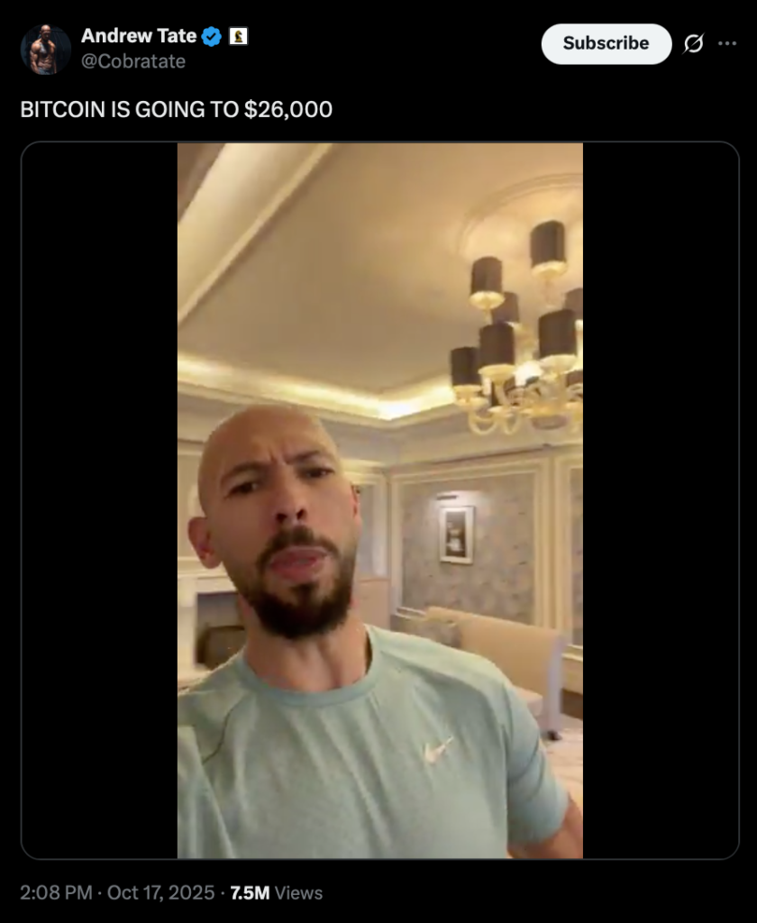 در همین حال، اندرو تیت، شخصیت جنجالی فضای مجازی و قهرمان سابق کیکبوکسینگ، پیشبینی کرده است که ممکن است بیت کوین تا سطح ۲۶,۰۰۰ دلار سقوط کند؛ همان محدودهای که در سپتامبر ۲۰۲۳ دیده شده بود. او باور دارد که خوشبینی کورکورانه معاملهگران، مانع از شکلگیری کف واقعی بازار شده است. تیت در پیامی به میلیونها دنبالکنندهاش گفت: