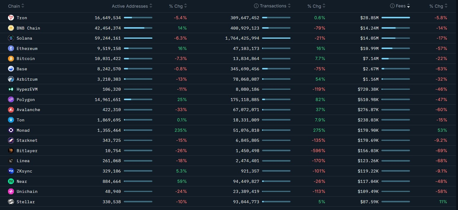 همه شبکه‌ها روند «تراکنش بالاتر و کارمزد کمتر» را تجربه نکرده‌اند. شبکه بی ان بی (BNB Chain) با کاهش شدید فعالیت روبه‌رو شده و تراکنش‌ها و کارمزدهای آن به‌ترتیب ۷۹ درصد و ۱۴ درصد کاهش یافته‌اند. در Base نیز تراکنش‌ها ۷۵ درصد و کارمزدها ۶۳ درصد افت کرده‌اند. HyperEVM بیشترین کاهش را ثبت کرده و با افت ۱۱۹ درصدی تراکنش‌ها و ۴۶ درصدی کارمزدها مواجه بوده است.
