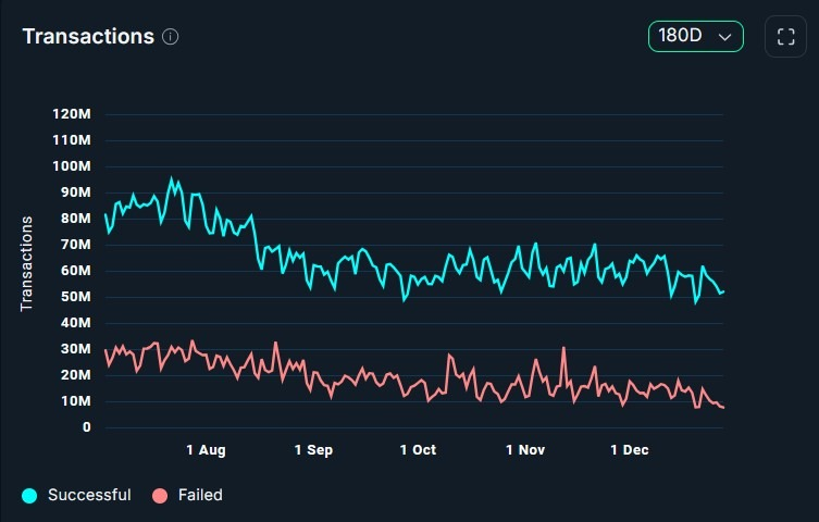 سولانا با ثبت حدود ۱.۷ میلیارد تراکنش همچنان شلوغ‌ترین شبکه باقی مانده، اما این رقم نیز نسبت به ماه قبل ۲۱ درصد کاهش یافته است. درآمد کارمزد سولانا در همین دوره ۱۷ درصد افت کرده است.