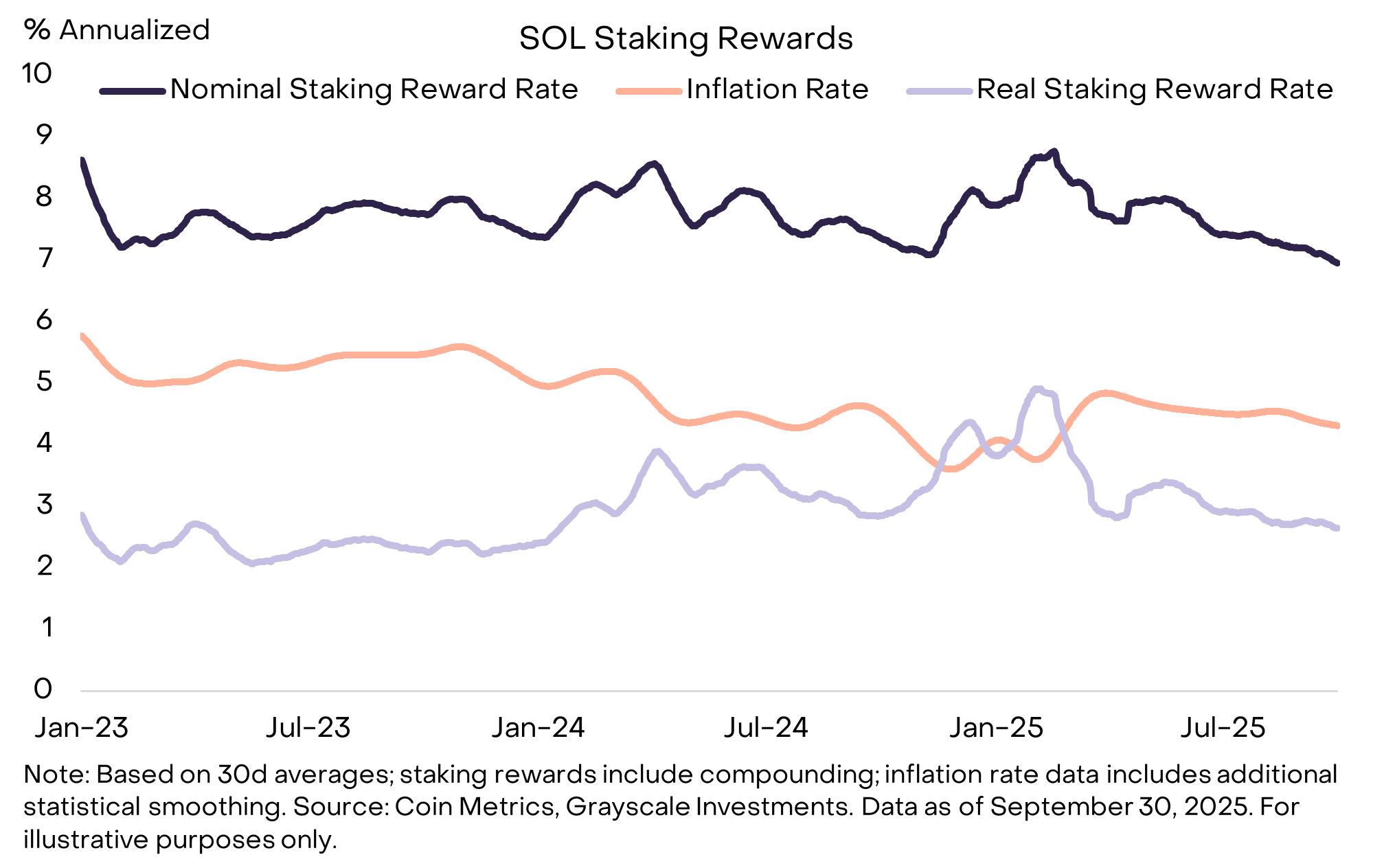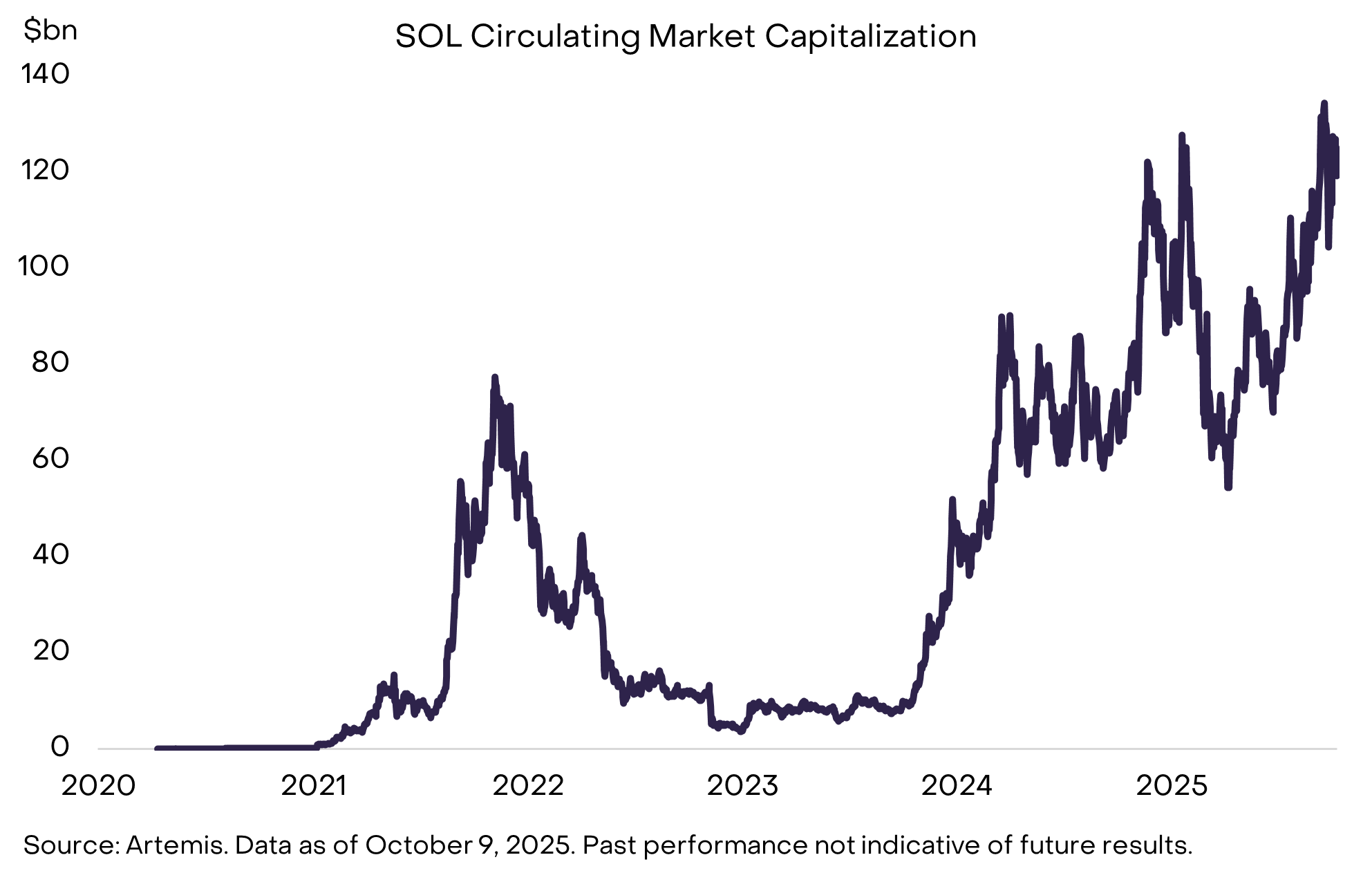 - توکن SOL این شبکه با ارزش فعلی حدود ۱۱۹ میلیارد دلار، پنجمین دارایی کریپتویی بزرگ از نظر ارزش بازار (به استثنای استیبلکوینها) و سومین دارایی از نظر نقدشوندگی است. عملکرد SOL از سال ۲۰۲۳ به طور قابل توجهی بهتر از گروه همتایان خود بوده است و هولدرهای آن میتوانند از طریق استیکینگ (Staking) نرخ پاداش اسمی تقریباً ۷٪ کسب کنند.