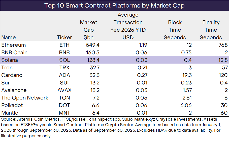 سولانا، در کنار اتریوم، بیانبی چین (BNB Chain)، ترون، کاردانو، سوئی (Sui) و سایر شبکهها، بخشی از «بخش پلتفرمهای قرارداد هوشمند» در دنیای کریپتو است. در میان این گروه، سولانا به دلیل عمق و تنوع فعالیت درونزنجیرهای خود متمایز است. امروزه این پلتفرم از نظر تعداد کاربران، حجم تراکنشها و کارمزدهای تراکنش پیشرو در این رده است. بلاکچینها فناوریهای شبکه هستند که یعنی عموماً، بزرگتر بودن بهتر است؛ کاربران بیشتر و فعالیت اقتصادی بیشتر معمولاً به معنای ارزش بالاتر شبکه است. اینها تنها ملاحظات مهم نیستند، اما در این اصول بنیادین بلاکچین، سولانا از همتایان خود متمایز میشود.