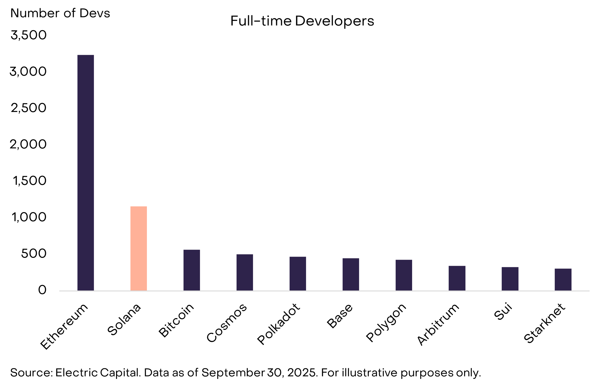 امروزه بیش از ۱۰۰۰ توسعهدهنده تماموقت بر روی سولانا و برنامههای مبتنی بر SVM کار میکنند و تعداد توسعهدهندگان متمرکز بر سولانا در دو سال گذشته سریعتر از هر پلتفرم قرارداد هوشمند دیگری رشد کرده است. این سرمایه انسانی میتواند به نوآوری مستمر و اختصاصی در سولانا در طول زمان کمک کند.