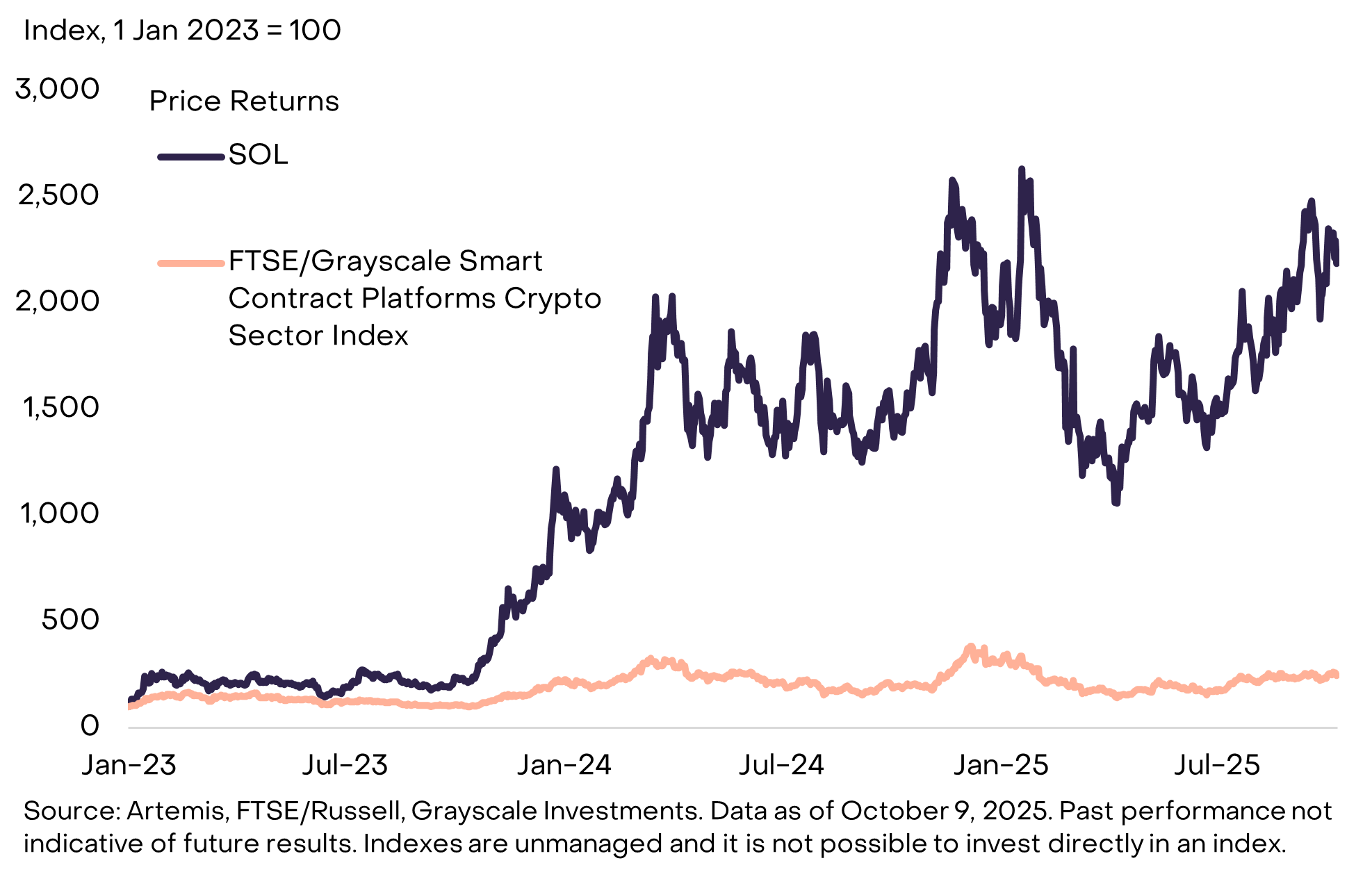 در چرخه قبلی کریپتو، قیمت توکن SOL از اوج خود یعنی تقریباً ۲۶۰ دلار در نوامبر ۲۰۲۱ به تنها ۲ دلار در دسامبر ۲۰۲۲ سقوط کرد. تا مدتی، سولانا با صرافی شکستخورده کریپتوی FTX مرتبط دانسته میشد که سرمایهگذاری کرده و برخی منابع توسعه را تأمین کرده بود. جای تعجب نیست که بسیاری از ناظران عادی در مورد آینده سولانا پس از ورشکستگی FTX مطمئن نبودند، حتی با وجود اینکه بسیاری از توسعهدهندگان SVM در اکوسیستم باقی ماندند. با این حال، از اواخر سال ۲۰۲۳، توکن SOL شروع به بهبودی کرد. از آن زمان، عملکرد آن به طور قابل توجهی بهتر از شاخص بخش پلتفرمهای قرارداد هوشمند کریپتوی FTSE/Grayscale بوده است.