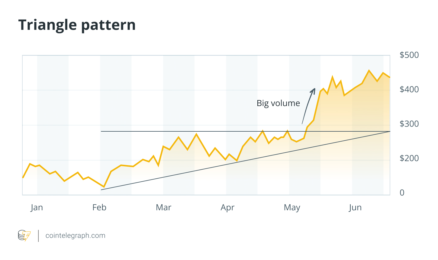 - مثال: در زمان عدم قطعیت بازار، نمودارها معمولاً تشکیل مثلث میدهند. در اوایل ۲۰۲۵، قیمت اتریوم (ETH)، در میان نگرانیها درباره مقررات دیفای، الگوی مثلث متقارن تشکیل داد و پس از شفافتر شدن قوانین، شکست صعودی داشت.