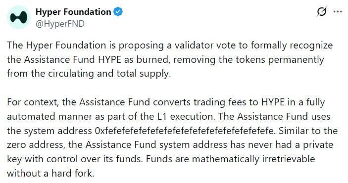 بنیاد هایپر (Hyper Foundation) پیشنهادی را برای رأیگیری میان ولیدیتورهای شبکه هایپرلیکویید مطرح کرده است که هدف آن، به رسمیت شناختن دائمیِ غیرقابلدسترس بودن توکنهای HYPE نگهداریشده در آدرس سیستمی صندوق کمکی (Assistance Fund) است.