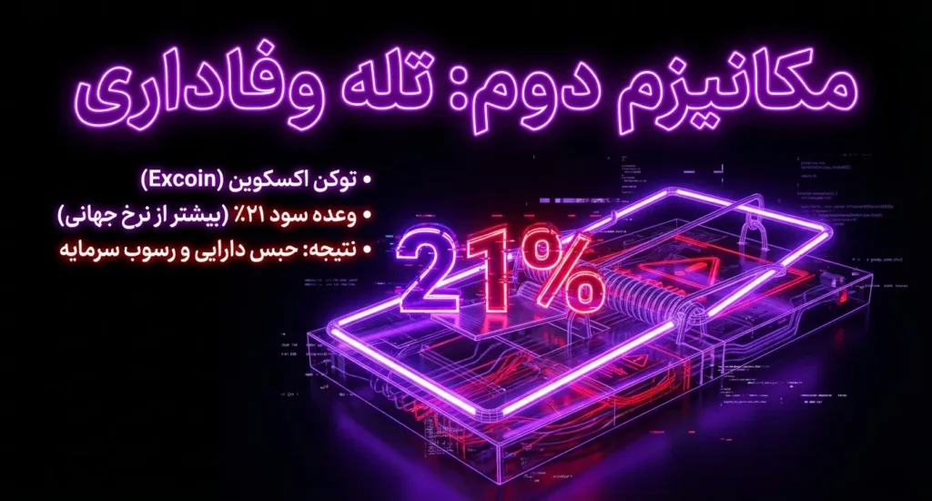 - مشابهت با کینگ مانی: ایجاد یک توکن/امتیاز داخلی (اکسکوین در مقابل کیم) و وعده سودهای کلان برای جلوگیری از خروج سرمایه و در نهایت بستن امکان برداشت.