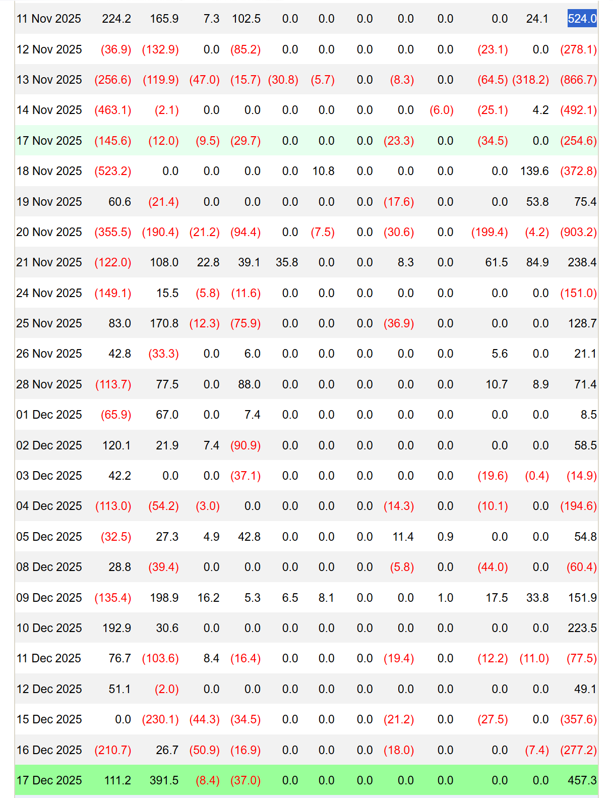این رشد پس از دورهای ناپایدار در ماه نوامبر و اوایل دسامبر رخ داد که جریان سرمایه بین ورودهای محدود و خروجهای تند در نوسان بود. آخرین بار ETFهای اسپات بیت کوین در تاریخ ۱۱ نوامبر (۲۰ آبان) بیش از ۴۵۰ میلیون دلار ورود سرمایه را تجربه کرده بودند؛ در آن زمان، مجموع جذب سرمایه روزانه به حدود ۵۲۴ میلیون دلار رسید.