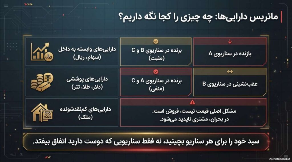 داراییهای وابسته به داخل: ریال، سهام داخلی، اوراق داخلی، ملک داخل کشور. اینها در سناریوهای بهبود و ثبات، میتوانند بازده خوبی بدهند، اما در سناریوهای شوک و فشار، ریسک سیستماتیک بالاتری دارند.