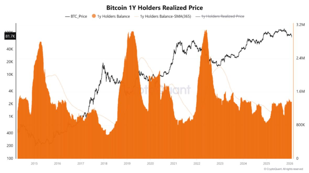 دادههای فعلی نشان میدهد بیت کوین در حال معامله زیر قیمت تحققیافته دارندگان ۱۲ تا ۱۸ ماهه است، که این گروه را وارد وضعیت زیان تحققنیافته (Unrealized PnL منفی) کرده است. از نظر تاریخی، زمانی که قیمت بیت کوین زیر این مبنای هزینه شکسته شده و در آن سطح باقی بماند، رفتار بازار از اصلاحات معمول به رژیمهای ساختاری نزولی تغییر میکند، نه صرفاً اصلاحات کوتاهمدت.