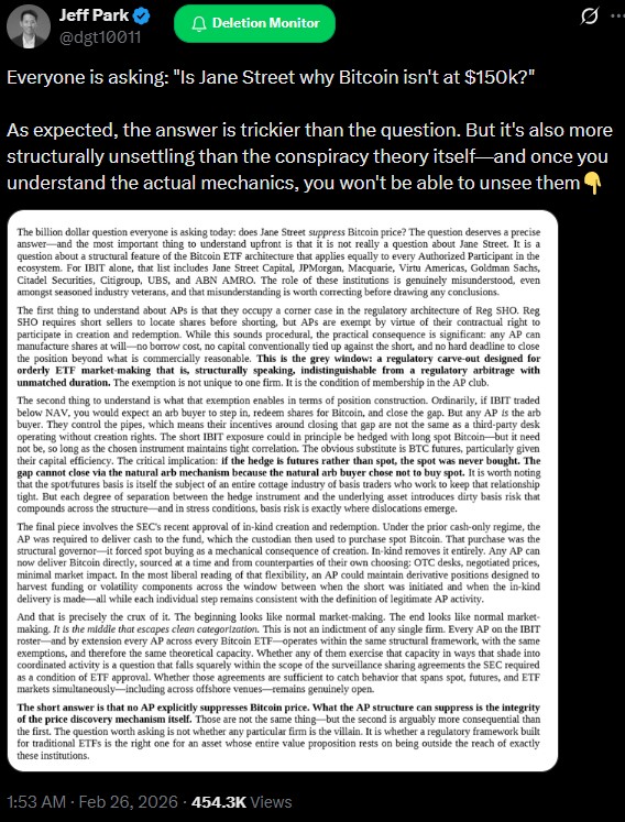به گزارش میهن بلاکچین، همزمان با انتشار جزئیات جدید از شکایت تیم تصفیه ترافورم لبز (Terraform Labs) علیه جین استریت و بالا گرفتن بحثها درباره تحلیل جف پارک (Jeff Park) در مورد نقصهای ساختاری ETFهای اسپات، موجی از هیجان و گمانهزنی بازار را فرا گرفته است. در فضای شبکههای اجتماعی، بسیاری باور دارند که قیمت بیت کوین باید امروز بسیار بالاتر از سطح فعلی باشد، اما مجموعهای از عوامل پنهان در سازوکار ETFها، روشهای پوشش ریسک و نقشآفرینی بازیگران بزرگ بازار، مانع این رشد قیمتی شده است.