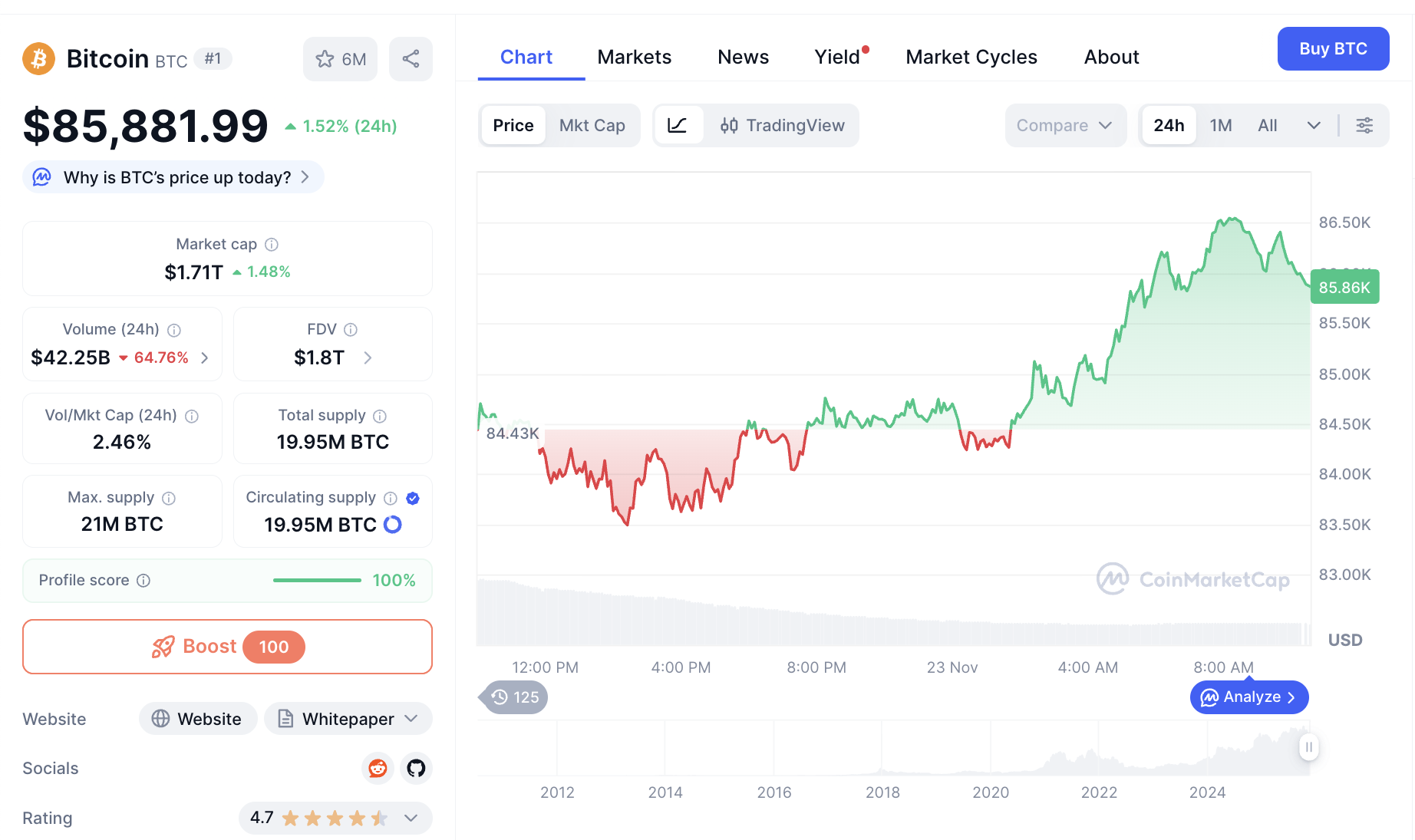 قیمت بیت کوین پس از ثبت اوج تاریخی ۱۲۵٬۱۰۰ دلار در تاریخ ۵ اکتبر (۱۳ مهر)، وارد روندی نزولی شد و تا سطح ۸۰٬۷۰۰ دلار پایین آمد. در زمان نگارش این مطلب نیز BTC در نزدیکی ۸۵,۹۰۰ دلار معامله میشود.