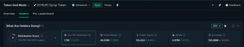 ساختار تکنیکال SYRUP نسبت به آپتیمیزم و آستر محافظهکارانهتر اما همچنان صعودی است. در ۳۰ روز گذشته، ۱۰۰ آدرس برتر حدود ۳.۴۷٪ به داراییهای خود اضافه کرده است و مجموع هولد این گروه را به ۱.۱۱ میلیارد توکن رساندهاند؛ این رقم با قیمت فعلی حدود ۴۹۹.۵ میلیون دلار ارزش دارد.