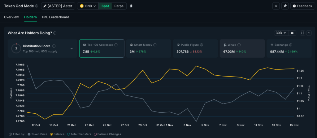 دومین دارایی مورد توجه نهنگها آستر (Aster) است که سرعت انباشت آن بسیار بالاتر از آپتیمیزم بوده است. کیف پولهای بزرگ طی ۳۰ روز گذشته میزان دارایی خود را ۱۴۰٪ افزایش داده و مجموع دارایی خود را به بیش از ۶۷.۰۳ میلیون توکن رساندهاند.