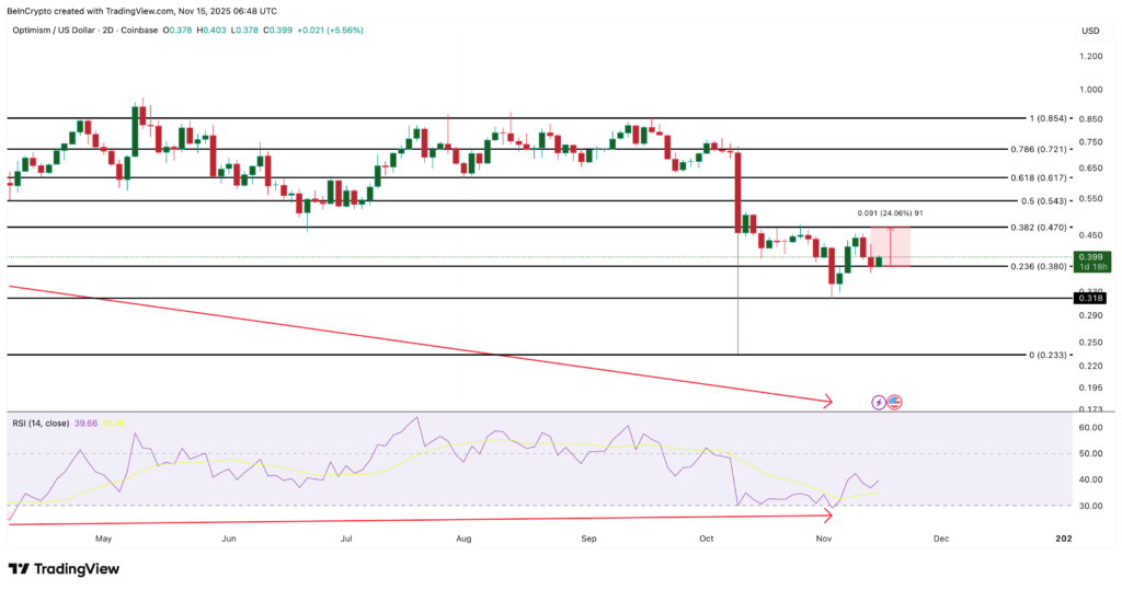 از منظر تکنیکال نیز این رویکرد بیپایه نیست. در تایمفریم دو روزه، قیمت OP بین ۷ آپریل تا ۳ نوامبر (۱۸ فروردین تا ۱۲ آبان) کف پایینتری ثبت کرده، اما شاخص قدرت نسبی (RSI) کف بالاتری ساخته است که یک واگرایی مثبت کلاسیک را نشان میدهد و معمولاً زمانی شکل میگیرد که فشار فروش در حال کاهش و بستر نوسان مثبت در حال تقویت است.